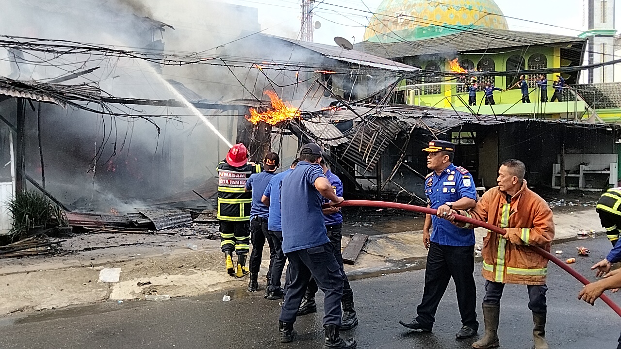 MetronewsJambi|Jambi Kebakaran hebat melanda enam kios di Jalan H. Adam Malik, RT 37, Kelurahan Thehok, Kecamatan Jambi Selatan, Rabu (21/1/2026) siang. Peristiwa tersebut mengakibatkan satu orang warga meninggal dunia dan puluhan jiwa terdampak.